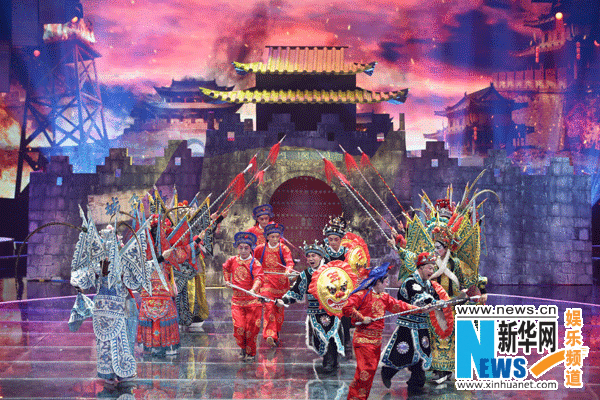 在最后的城市名片環(huán)節(jié), 三門峽的戰(zhàn)隊成員豫劇名家小香玉率先開唱“黃河滔滔流不盡……”,接下來距今五千年至七千年前,華夏民族祖先在這里農(nóng)耕生活的場景在舞臺上呈現(xiàn):采石磨刀砍木、制做精美彩陶成瓢裝水、用石竹狩獵,華夏子孫從蒙昧走向文明的分水嶺--仰韶文化的生活畫面展現(xiàn)在觀眾面前。