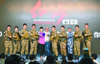 雖然同為軍事題材影片,但不同于《戰(zhàn)狼2》中的孤膽英雄,《紅海行動(dòng)》中的地面行動(dòng)主要由一支蛟龍突擊隊(duì)完成,這支突擊隊(duì)由8人組成,分別由張譯、杜江、黃景瑜、蔣璐霞、尹昉、郭家豪、王雨甜和麥亨利扮演,昨天他們也身著迷彩服和裝備亮相,軍姿颯爽。現(xiàn)場,張譯儼然變成海軍的“迷弟”,大呼“中國的軍艦好大啊,那個(gè)不是我們普通的老百姓能感受得到的,只有你真正看到的時(shí)候,你才會(huì)發(fā)現(xiàn)我們中國海軍的力量越來越強(qiáng)大了。在這樣的軍艦保護(hù)之下,會(huì)覺得很安全!焙G逡苍谄谐鲅萘艘幻浾撸⒈挥诙{(diào)侃為“海大膽兒”:“開拍前我們居然在中國找不到女一號(hào),大家想得到的當(dāng)紅明星都很忙,聽說是林超賢的戲都覺得好,但一聽去摩洛哥這么久,看看地圖她們都怕了,只有我們海清,一聽說就馬上跟劇組報(bào)到。我特別感動(dòng)!