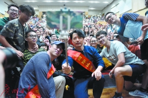 段奕宏帶著《暴雪將至》到華南理工大學(xué)大學(xué)城校區(qū)放映,和學(xué)生見面玩自拍,段奕宏身上的“3A國際認(rèn)證”字樣,寓意他已拿下3座國際A類電影節(jié)最佳男主角獎。 王維宣 攝影