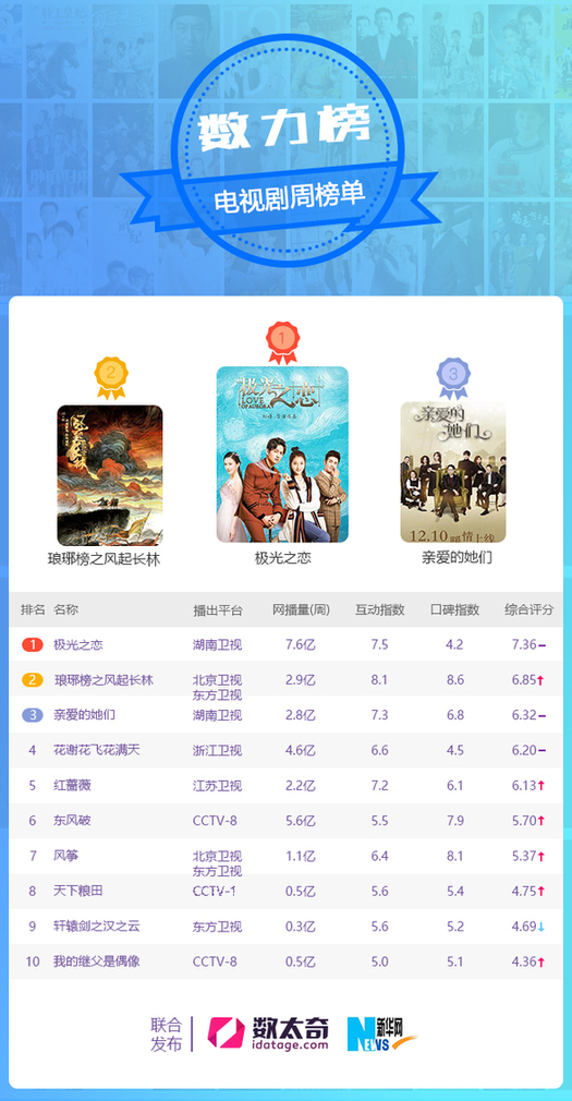 在本周電視劇全網(wǎng)傳播指數(shù)排行榜中,黃曉明、佟麗婭等主演的古裝權(quán)謀劇《瑯琊榜之風(fēng)起長(zhǎng)林》強(qiáng)勢(shì)開播,作為《瑯琊榜》續(xù)篇,此片中雖然演員全變,但是品質(zhì)依舊,口碑不俗,獲得榜單亞軍。另一部躋身前五的新劇是由耀客傳媒出品的年代諜戰(zhàn)劇《紅薔薇》,近日劇情中陳曉扮演的貴公子肖君浩暫時(shí)離開楊子姍扮演的夏雨竹,讓觀眾倍感不舍。