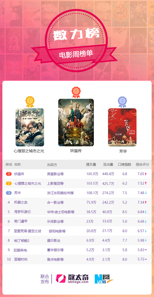 新華網(wǎng)與數(shù)太奇大數(shù)據(jù)中心聯(lián)合發(fā)布電影、電視及綜藝節(jié)目網(wǎng)絡(luò)傳播效果數(shù)力榜,在第52周榜單中,由陳凱歌執(zhí)導(dǎo),黃軒、染谷將太等演員傾力加盟的《妖貓傳》強(qiáng)勢(shì)上映,大氣唯美的場(chǎng)景及黃軒版白居易的完美呈現(xiàn)吸引了大批粉絲的關(guān)注與討論,提及量和互動(dòng)量數(shù)據(jù)優(yōu)勢(shì)明顯。由成龍主演并監(jiān)制的賀歲動(dòng)作大片《機(jī)器之血》同期登錄各大影院,成龍大哥號(hào)召力依舊強(qiáng)勁,上映首日便收獲當(dāng)日票房冠軍。