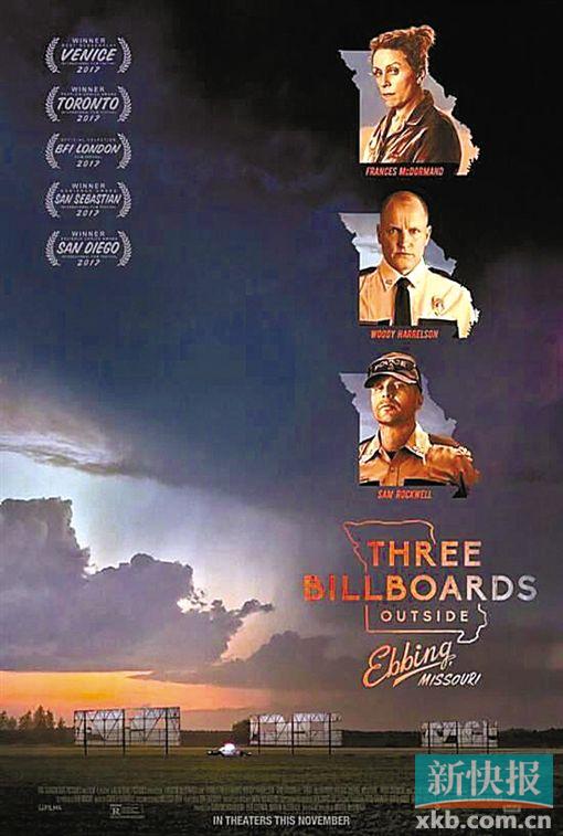 由英國著名導演馬丁-麥克唐納執(zhí)導的黑色懸疑電影《三塊廣告牌》日前正式宣布定檔3月2日登陸中國內地,將在全國藝術電影放映聯(lián)盟旗下影院公映。《三塊廣告牌》在剛剛落幕的第75屆美國電影電視金球獎上一舉拿下劇情類最佳影片、劇情類影片最佳女主角、劇情類影片最佳男配角、最佳電影劇本4個重量級獎項,成為當晚的最大贏家。