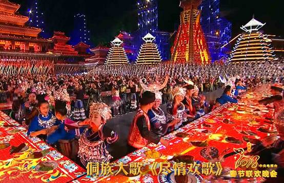 除了央視主會(huì)場(chǎng)帶來的歡聲笑語,觀眾同樣可以在四個(gè)分會(huì)場(chǎng)感受到神州大地的盛世大聯(lián)歡。在貴州黔東南分會(huì)場(chǎng)肇興侗寨,萬人侗族大歌合唱團(tuán)演唱《盡情歡歌》,展現(xiàn)了脫貧致富的農(nóng)村新貌和各族人民邁進(jìn)新時(shí)代的自豪感和獲得感;廣東珠海分會(huì)場(chǎng)港珠澳大橋上演了無人機(jī)、無人艇、無人車大秀,光影技術(shù)和前沿科技打造出一幅幅夢(mèng)幻絢爛的盛大場(chǎng)景,觀眾從中能體驗(yàn)到全面深化改革給廣東珠海帶來的創(chuàng)新活力與開放魅力;山東分會(huì)場(chǎng)選址于曲阜和泰安兩地,觀眾在古樸氛圍中聆聽中華文化源遠(yuǎn)流長(zhǎng)、歷久彌新的盛世樂章,以及國(guó)泰民安的美好祝愿;海南三亞分會(huì)場(chǎng)在高科技和體育元素相互映襯下,讓人情不自禁跟著國(guó)際旅游島的青春節(jié)拍一起唱起來、跳起來。分會(huì)場(chǎng)的設(shè)置,讓春晚的祥和氣氛感染了更多人,也將更多地域性的民俗特色傳遞給更多人,共同營(yíng)造了一個(gè)“全國(guó)人民大聯(lián)歡”。