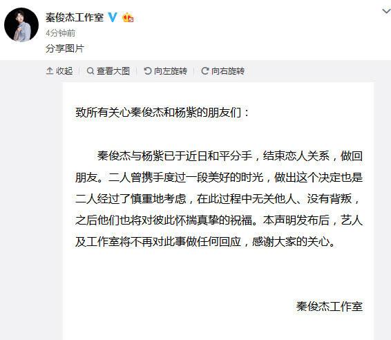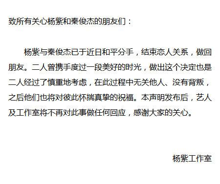 8月12日下午,“秦俊杰工作室”和“小猴紫日志”都發(fā)布了一則微博,宣布秦俊杰和楊紫兩人和平分手,“結(jié)束戀人關系,做回朋友”。網(wǎng)友們感到驚詫:8月真是分手月!繼紀凌塵、闞清子到歐豪、馬思純分手后,秦俊杰和楊紫也分開了。vRy安康新聞網(wǎng)