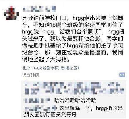 17日,有網(wǎng)友在網(wǎng)上曬出兩張照片,并配文稱:“不知道18哪個班級的全班同學叫住了劉昊然,說:昊然哥哥,給我們合個影唄。劉昊然扭頭過來了,我以為是要和他合影,同學們愣是把手機塞給了劉昊然,讓他幫忙給拍了班級合影。那一刻現(xiàn)場的觀眾是蒙的!闭掌,新生班級全體同學站在大門前,面對鏡頭,笑得十分開心。而劉昊然站在他們前面,拿著手機,幫學弟學妹們照相。