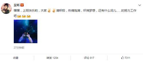 10月8日,吳昕在自己微博上傳一張照片,并配文稱:“嘿嘿,上班快樂喲,大家請積極,熱情飽滿,懷揣夢想,還有什么詞兒……的努力工作吧1Hkh安康新聞網(wǎng)