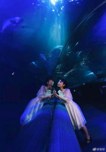 照片中的她身穿白色亮片連衣裙,腳踩復(fù)古皮鞋。她站在海底隧道,手撫玻璃,與海洋生物們互動,十分可愛。Hkh安康新聞網(wǎng)