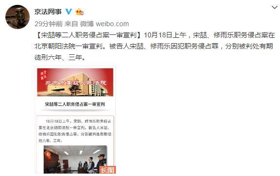 人民網(wǎng)北京10月18日電 據(jù)北京法院網(wǎng)官方微博消息,10月18日上午,宋喆、修雨樂職務(wù)侵占案在北京朝陽法院一審宣判。被告人宋喆、修雨樂因犯職務(wù)侵占罪,分別被判處有期徒刑六年、三年。