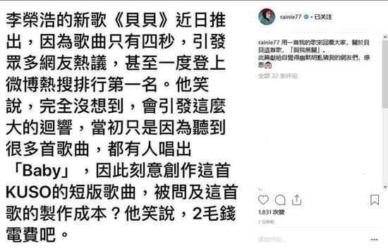 10月17日,楊丞琳社交網(wǎng)發(fā)文:“用一首我的歌來回復(fù)大家,關(guān)于貝貝這首歌,《與我無關(guān)》。此篇獻(xiàn)給自覺得幽默胡亂猜測的網(wǎng)友們,感恩!彼曬出截圖,解釋李榮浩新歌《貝貝》的靈感來源。JYt安康新聞網(wǎng)