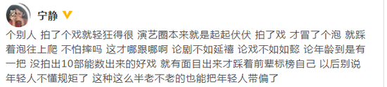 10月22日,寧?kù)o發(fā)文怒戇耍大牌”現(xiàn)象:“個(gè)別人,拍了個(gè)戲就輕狂得很!演藝圈本來(lái)就是起起伏伏,拍了戲、才冒了個(gè)泡就踩著泡往上爬,不怕摔嗎?這才哪跟哪啊?論劇不如延禧、論戲不如如懿!論年齡到是有一把!沒拍出10部能數(shù)出來(lái)的好戲,就有面目出來(lái)才踩著前輩標(biāo)榜自己!以后別說(shuō)年輕人不懂規(guī)矩了,這種這么半老不老的也能把年輕人帶偏了1