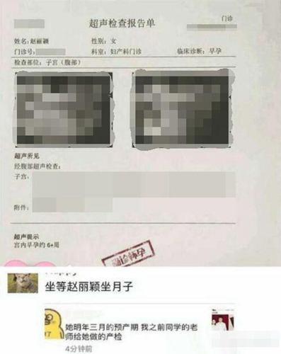 最近微博上流傳一張“趙麗穎超音波檢查報(bào)告”,圖中可清楚看到子宮內(nèi)已有胎兒,報(bào)告寫(xiě)著“宮內(nèi)早孕約6+周”,還有蓋上“確診懷孕“的印章,更有網(wǎng)友爆料趙麗穎目前懷孕五個(gè)多月,預(yù)產(chǎn)期就在明年三月。