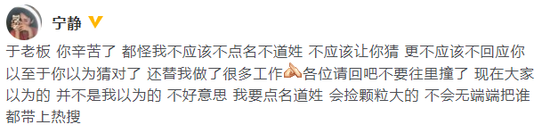 23日,寧靜在自己微博發(fā)文,回應(yīng)怒懟某演員一事。她寫道:“于老板,你辛苦了!都怪我不應(yīng)該不點名不道姓,不應(yīng)該讓你猜、更不應(yīng)該不回應(yīng)你,以至于你以為猜對了,還替我做了很多工作。各位請回吧不要往里撞了,現(xiàn)在大家以為的,并不是我以為的。不好意思 ,我要點名道姓,會撿顆粒大的。不會無端端把誰都帶上熱搜!g4k安康新聞網(wǎng)