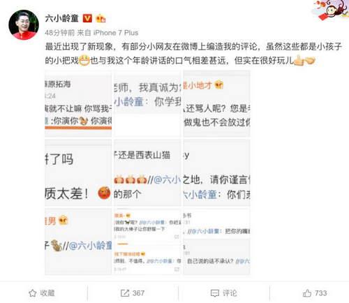10月24日,演員六小齡童發(fā)文稱:“最近出現(xiàn)了新現(xiàn)象,有部分小網(wǎng)友在微博上編造我的評論,雖然這些都是小孩子的小把戲,也與我這個(gè)年齡講話的口氣相差甚遠(yuǎn),但實(shí)在很好玩兒!彪S文配發(fā)的圖片中截取了某高仿號的微博評論,該高仿號以極其惡劣的口吻及字眼怒罵粉絲,造成了粉絲的不解已經(jīng)及六小齡童本人的困擾。