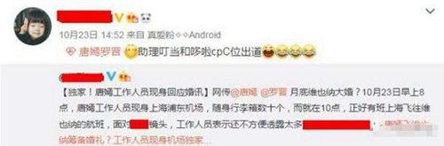 10月23日早上8點(diǎn),媒體在上海浦東機(jī)場偶遇唐嫣羅晉的助理合體現(xiàn)身值機(jī)柜臺。粉絲認(rèn)出這一男一女分別是羅晉助理哆啦和唐嫣助理兼閨蜜叮當(dāng),兩人推著十幾個行李箱辦理托運(yùn)手續(xù),并辦理了長達(dá)30分鐘的托運(yùn)手續(xù)。當(dāng)被問到婚訊一事,工作人員表示還不方便透露太多。當(dāng)天10點(diǎn),正好有班上海飛維也納的航班。