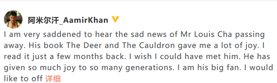 印度著名影星阿米爾汗也在微博上悼念金庸,并表示自己是他的忠實粉絲,得知他去世的消息非常難過。APE安康新聞網(wǎng)