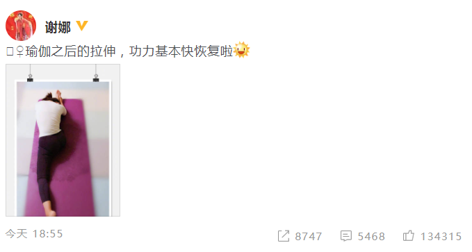 11月4日,謝娜在自己微博曬出一張鍛煉的照片,并配文稱:“瑜伽之后的拉伸,功力基本快恢復(fù)啦1照片中的她身穿運(yùn)動服,在瑜伽墊上進(jìn)行拉伸。她劈叉壓腿,看起來十分專業(yè)。nRt安康新聞網(wǎng)