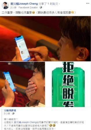 鄭元暢在轉(zhuǎn)發(fā)的貼文中搞笑地說,聽說最近有不少人有諸如此類的困擾,似乎是指有人為了頭發(fā)多寡所擾,他不忘溫馨提醒:“工作重要,頭發(fā)也很重要!