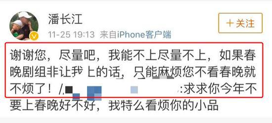 日前,有網(wǎng)友在某社交平臺(tái)上喊話潘長(zhǎng)江,跪求潘長(zhǎng)江離開春晚的舞臺(tái)。該網(wǎng)友表示:“求求您今年不要上春晚好不好!我看煩了你的小品111月25日,潘長(zhǎng)江本人也對(duì)該言論進(jìn)行了回復(fù)。潘長(zhǎng)江表示:“謝謝您,我盡量,不過若是節(jié)目組非讓我上的話,就只能麻煩您不看春晚了1SUP安康新聞網(wǎng)