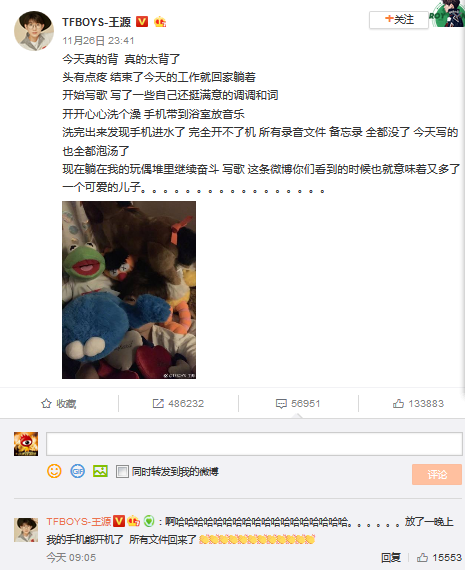 11月26日,王源發(fā)微博分享自己很“背”的一天,表示洗澡時手機進水,寫的歌都泡湯了。27日早,他又自己評論,“哈哈哈哈放了一晚上我的手機能開機了 ,?所有文件回來了 !ATB安康新聞網(wǎng)