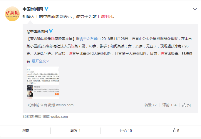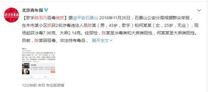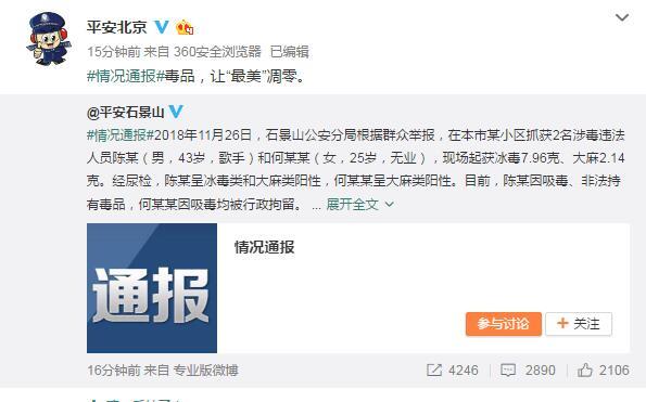 2018年11月26日,石景山公安分局根據(jù)群眾舉報,在本市某小區(qū)抓獲2名涉毒違法人員陳某(男,43歲,歌手)和何某某(女,25歲,無業(yè)),現(xiàn)場起獲冰毒7.96克、大麻2.14克。經(jīng)尿檢,陳某呈冰毒類和大麻類陽性,何某某呈大麻類陽性。目前,陳某因吸毒、非法持有毒品,何某某因吸毒均被行政拘留。此案正在進一步工作中。