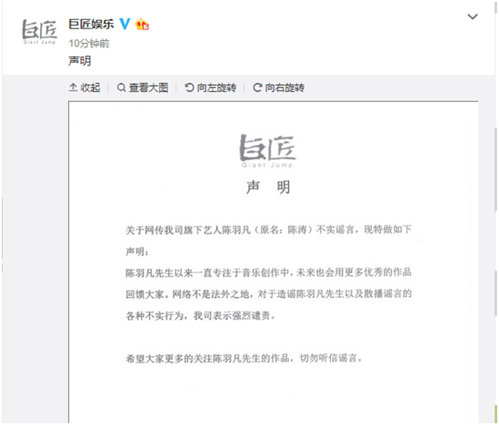 【環(huán)球網(wǎng)報道 記者 查!筷愑鸱补揪藿硦蕵饭俜轿⒉┌l(fā)布最新聲明,否認(rèn)網(wǎng)曝關(guān)于陳羽凡的不實傳聞,稱:“陳羽凡先生一直專注于音樂創(chuàng)作中!辈⒈硎尽皩τ谠熘{陳羽凡先生以及散播謠言的各種不實行為,我司表示強烈譴責(zé)。
