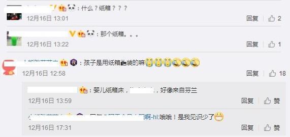 不過眼尖的網(wǎng)友卻指出,“為啥要把孩子放紙箱里?”,是啊,按理說剛出生的嬰兒都是放在嬰兒床,怎么能放紙箱呢?對于網(wǎng)友的疑問,知情者表示這種紙箱叫做嬰兒紙箱床,還是芬蘭的進口貨,這東西還真是頭一次聽說。