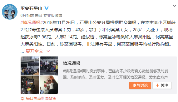 11月28日,平安石景山在微博發(fā)文,稱:“石景山公安分局根據(jù)群眾舉報,在本市某小區(qū)抓獲2名涉毒違法人員陳某(男,43歲,歌手)和何某某(女,25歲,無業(yè)),現(xiàn)場起獲冰毒7.96克、大麻2.14克。經(jīng)尿檢,陳某呈冰毒類和大麻類陽性,何某某呈大麻類陽性。目前,陳某因吸毒、非法持有毒品,何某某因吸毒均被行政拘留。此案正在進一步工作中。”