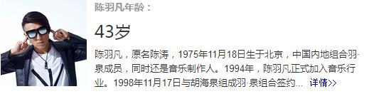 據(jù)悉,今日一直傳吸毒被抓的陳羽凡,百度百科顯示年齡正好也是43歲。昨夜網(wǎng)上傳出消息陳羽凡吸毒被抓,今日早上陳羽凡工作室發(fā)文回應是謠言。