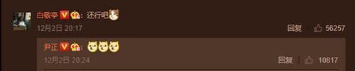 12月2日晚,尹正在自己微博曬出一段視頻,曬出自己的球鞋。隨后,白敬亭在評論區(qū)留言:“還行吧!辈⑴渖弦粋貓咪表情,尹正回以狗頭表情,兩人互動十分搞笑……