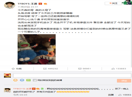 11月26日,王源發(fā)微博分享自己很“背”的一天,表示洗澡時手機進水,寫的歌都泡湯了。27日早,他又自己評論,“哈哈哈哈放了一晚上我的手機能開機了 ,?所有文……