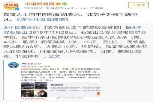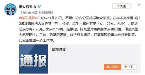 11月28日,平安石景山在微博發(fā)文,稱:“石景山公安分局根據(jù)群眾舉報,在本市某小區(qū)抓獲2名涉毒違法人員陳某(男,43歲,歌手)和何某某(女,25歲,無業(yè)),現(xiàn)……