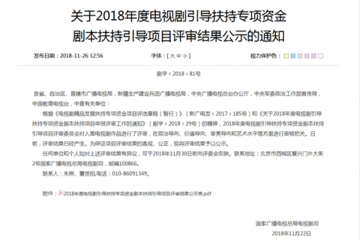 , , 11月27日,國家廣播電視總局官網(wǎng)發(fā)布《關于2018年度電視劇引導扶持專項資金劇本扶持引導項目評審結果公示的通知》,經(jīng)過評審委員會在政治導向、價值導向……