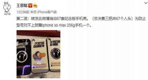11月14日下午,王思聰再次宣布IG奪冠第二波微博抽獎(jiǎng)活動(dòng)開(kāi)啟,王思聰發(fā)文稱:“第二波:轉(zhuǎn)發(fā)此微博抽出67套紀(jì)念版手機(jī)殼。(總決賽三把共67個(gè)人頭)為防止型號(hào)……