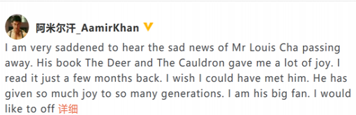 印度著名影星阿米爾汗也在微博上悼念金庸,并表示自己是他的忠實粉絲,得知他去世的消息非常難過。 阿米爾汗:聽到金庸先生去世的消息,我非常難過。 他的小說……