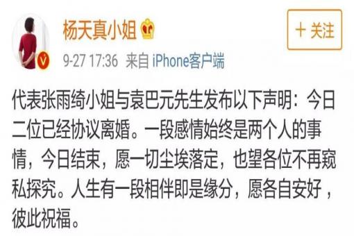 社會我綺姐,做事果斷,快狠準。 就在剛剛,張雨綺的經(jīng)紀人代表張雨綺袁巴元發(fā)布聲明,稱兩人已于今日協(xié)議離婚。 從家庭糾紛消息曝出,到離婚,不過一天時間。 ……
