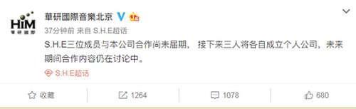 25日,有臺媒報(bào)道S.H.E另外兩位成員任家萱Selina、田馥甄Hebe也將在合約到期后出走華研。對此,華研發(fā)文回應(yīng),“S.H.E三位成員與本公司合作尚未屆期,接下來三……