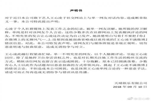 王心凌方就懟網(wǎng)友事件發(fā)聲明:切勿惡意轉(zhuǎn)述