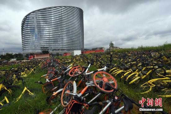 9月9日,現(xiàn)場(chǎng)堆積如山的共享單車(chē)。近半年來(lái),位于昆明市盤(pán)龍區(qū)的閑置荒地里堆放了大量的共享單車(chē),數(shù)量已超萬(wàn)輛。中新社記者 李進(jìn)紅 攝