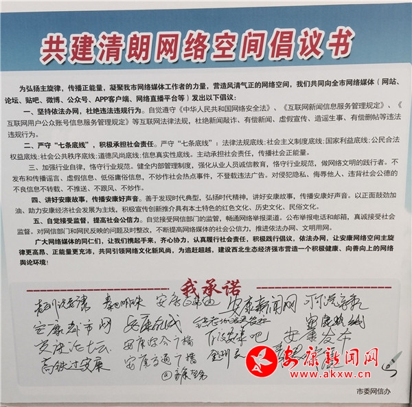 會(huì)議組織傳達(dá)學(xué)習(xí)了省市輿論環(huán)境集中整治專項(xiàng)行動(dòng)工作會(huì)議精神;市公安局、市文廣局就網(wǎng)絡(luò)輿論環(huán)境整治工作做了匯報(bào)發(fā)言;與會(huì)人員共同發(fā)起并簽訂了《共建安康清朗網(wǎng)絡(luò)空間倡議書》;5家網(wǎng)絡(luò)媒體及平臺(tái)代表圍“繞弘揚(yáng)主旋律、傳播正能量,營造清朗網(wǎng)絡(luò)空間”進(jìn)行了表態(tài)發(fā)言。