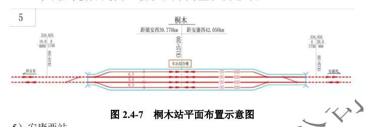 車站初始規(guī)3臺(tái)8線布置,遠(yuǎn)期隨天水一十堰鐵路引入預(yù)留1臺(tái)2線(PS:另一條高鐵過(guò)境安康,美),總規(guī)模4臺(tái)10線。到發(fā)線有效長(zhǎng)650m,設(shè)島式站臺(tái)(450×12×1.25m)4座,設(shè)旅客進(jìn)出站地道2座(寬12m)。