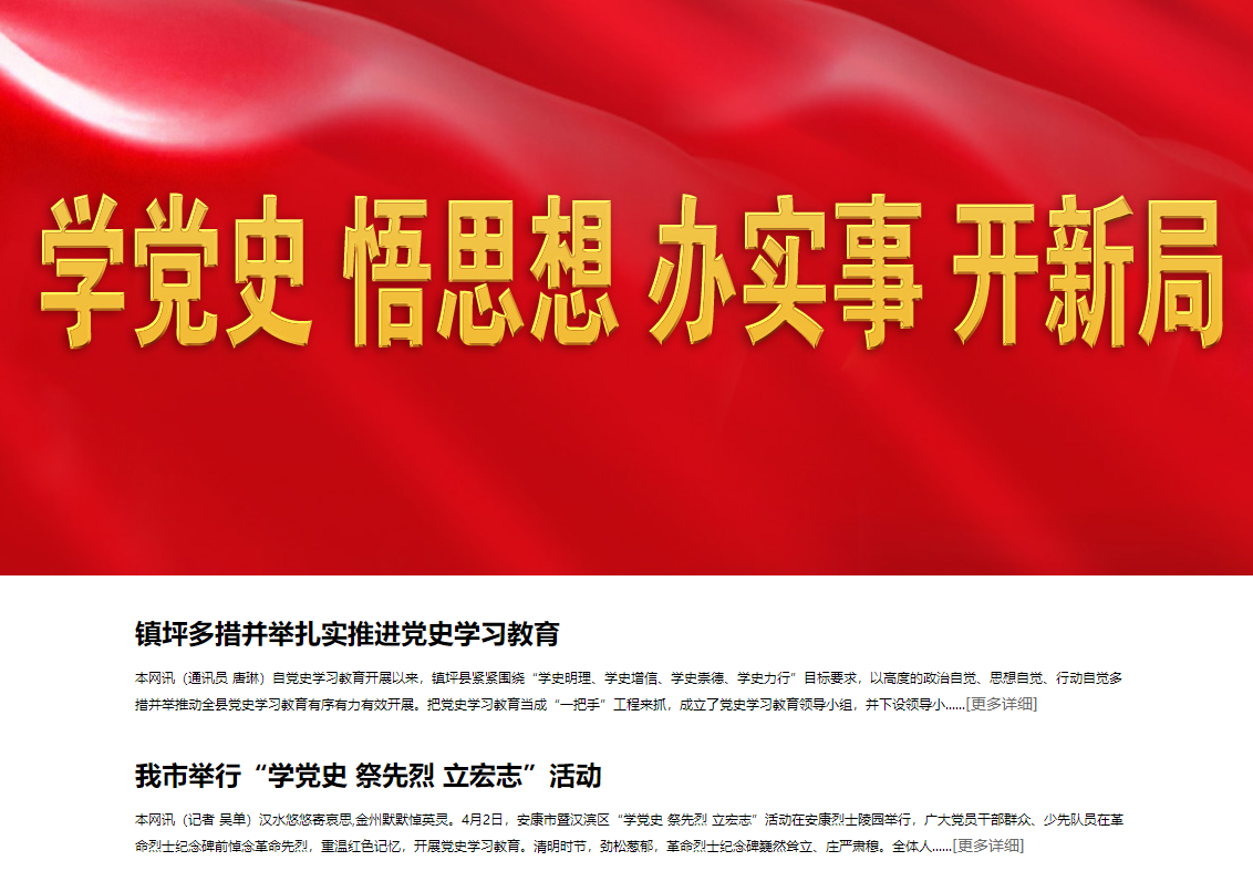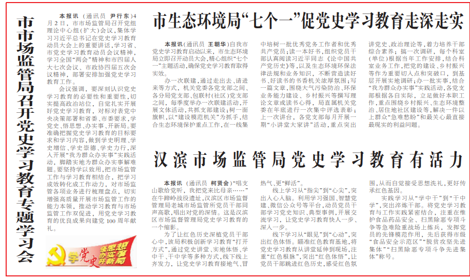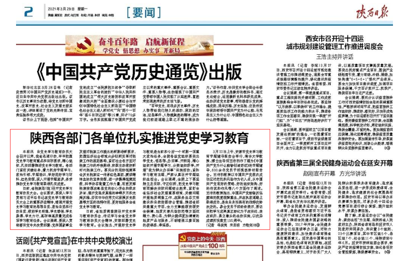 3月29日以來(lái),《陜西日?qǐng)?bào)》以《全省各部門各單位扎實(shí)推進(jìn)黨史學(xué)習(xí)教育》為題,對(duì)我市舉行首場(chǎng)黨史學(xué)習(xí)教育專題報(bào)告會(huì)進(jìn)行了報(bào)道。緊接著,“學(xué)習(xí)強(qiáng)國(guó)”推出了《陜西安康市漢濱區(qū):忠魂千秋耀山鄉(xiāng) 慷慨奮進(jìn)著新篇》《激戰(zhàn)牛蹄嶺 碧血映山河》兩篇報(bào)道。陜西廣播電視臺(tái)、群眾新聞網(wǎng)、西部網(wǎng)集中播出我市策劃拍攝的《繼承廖乾五的革命精神 凝聚起百年奮進(jìn)新征程強(qiáng)大力量》的主題報(bào)道!妒形N嘧釉谂L銕X開(kāi)展黨史學(xué)習(xí)教育》視頻新聞被新華網(wǎng)、陜西法制網(wǎng)轉(zhuǎn)載。