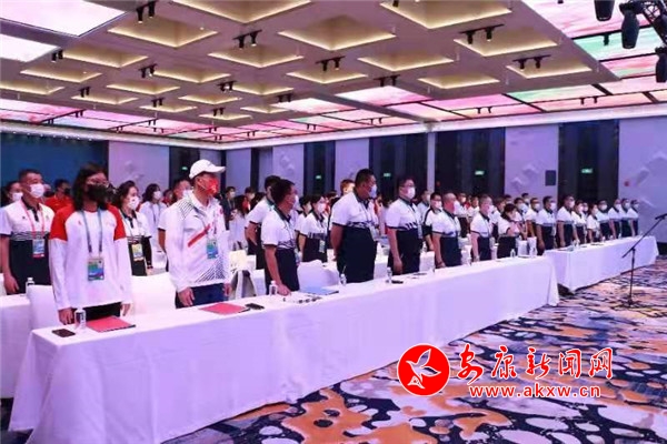 會議在莊嚴的國歌聲中開始,全體運動員、教練員、技術官員身著隊服,肅立齊唱國歌。