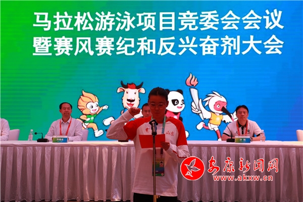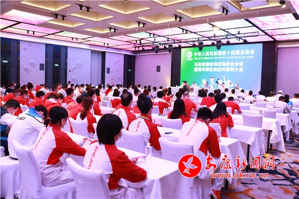許琦宣讀了《第十四屆全國運動會賽風賽紀違規(guī)處罰規(guī)定》、《第十四屆全國運動會賽風賽紀和反興奮劑工作的通知》。運動員、教練員、技術官員代表進行了反興奮劑宣誓,競委會各處室負責人、全體技術官員、各運動隊簽署了賽風賽紀和反興奮劑承諾書。