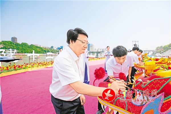 2021年,第二十一屆安康龍舟節(jié)開幕式上,嘉賓為龍頭點睛。 潘潤生 攝