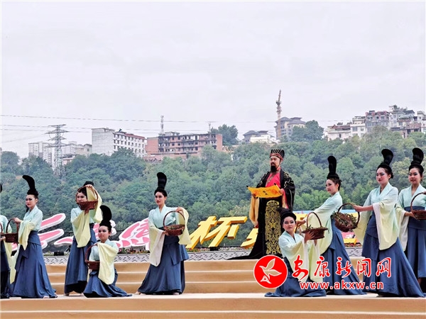 悠悠古琴聲中,青衣女子們手提竹籃蹁躚而來。“緬懷先賢”,主祭官一聲令下,全場(chǎng)矚目中,9位大漢護(hù)送屈原像至舞臺(tái)中央,開幕式翻開祭祀篇章。主祭官走向高臺(tái)仰頸高呼:“詠頌祭文……”百名身著漢服、手持竹簡(jiǎn)的孩童齊聲詠頌,頓挫抑揚(yáng),激蕩云霄。“萬民歡慶歌盛世,安瀾裕阜唱安康。”典禮儀成,青衣女子們“兵分兩列”,一列把竹籃里面的粽子拋向江中,追念先賢,一列繞場(chǎng)為現(xiàn)場(chǎng)觀眾贈(zèng)發(fā)香包,送上幸福安康的祝福。
