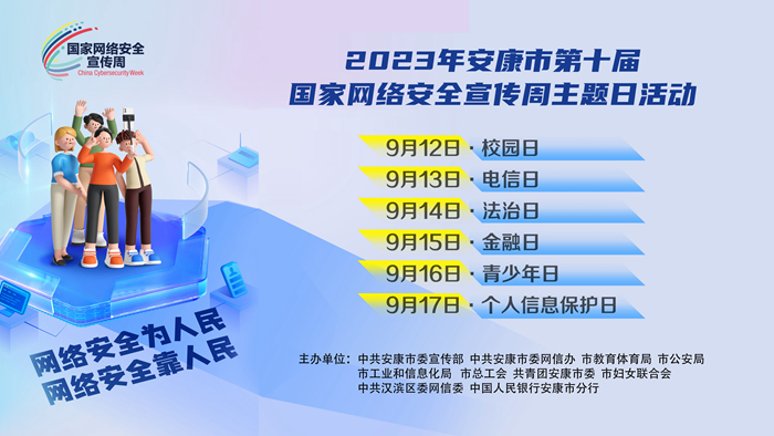 本網(wǎng)訊(記者 趙漪湉)2023年安康市第十屆國(guó)家網(wǎng)絡(luò)安全宣傳周將于9月11日至17日在全市范圍內(nèi)統(tǒng)一開(kāi)展。開(kāi)幕式、網(wǎng)絡(luò)安全科技成果展、網(wǎng)絡(luò)安全技能競(jìng)賽、網(wǎng)絡(luò)安全大講堂、“六大主題日”活動(dòng)等重要活動(dòng)將輪番舉行。今年網(wǎng)安周繼續(xù)以“網(wǎng)絡(luò)安全為人民,網(wǎng)絡(luò)安全靠人民”為主題,通過(guò)展覽、競(jìng)賽、講堂等形式,實(shí)現(xiàn)每一主題日都有主題、有活動(dòng),全面營(yíng)造全社會(huì)共筑網(wǎng)絡(luò)安全防線濃厚氛圍。我市網(wǎng)安周期間,有哪些精彩活動(dòng)可以參與?