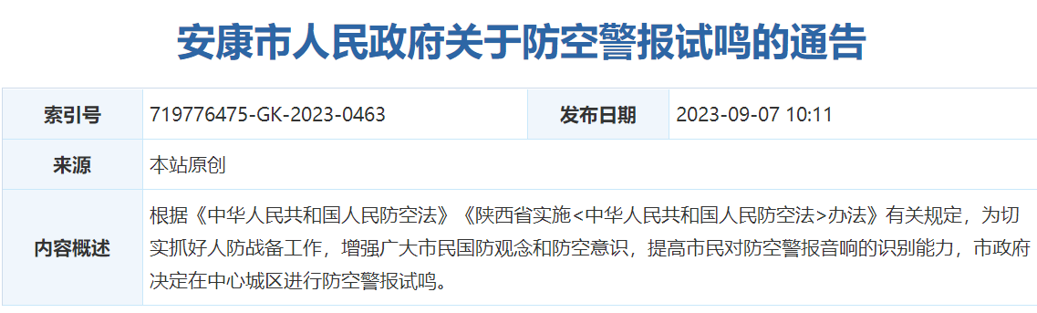 安康市人民政府關(guān)于防空警報(bào)試鳴的通告