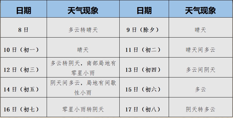 本網(wǎng)訊 2月7日10時,市氣象臺發(fā)布《春節(jié)天氣預報》:春節(jié)前期(除夕到初二)我市以晴天到多云天氣為主,氣溫回升明顯,預計全市最高氣溫升至15℃以上,東部縣區(qū)可能接近20℃;初三,陰天,南部局地零星小雨;初四,多云間陰天;初五陰天有間歇性小雨;初六多云;初七零星小雨轉陰天;初八陰天轉多云。