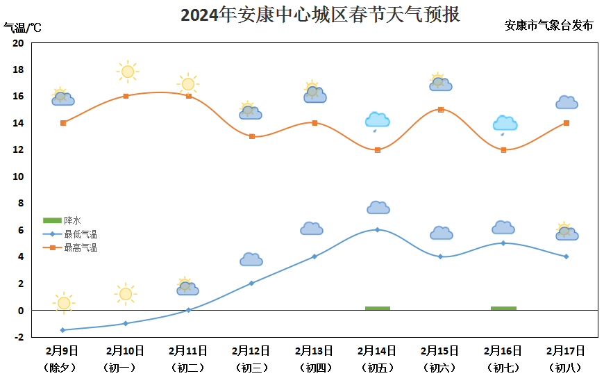 春節(jié)期間冷空氣對我市影響較小,最高氣溫起伏不大,預計川道地區(qū) 11~18℃,秦巴山區(qū):8~14℃,最低氣溫初三以前相對較低,后期有所升高:川道地區(qū) -2~5℃,秦巴山區(qū):-5~1℃。