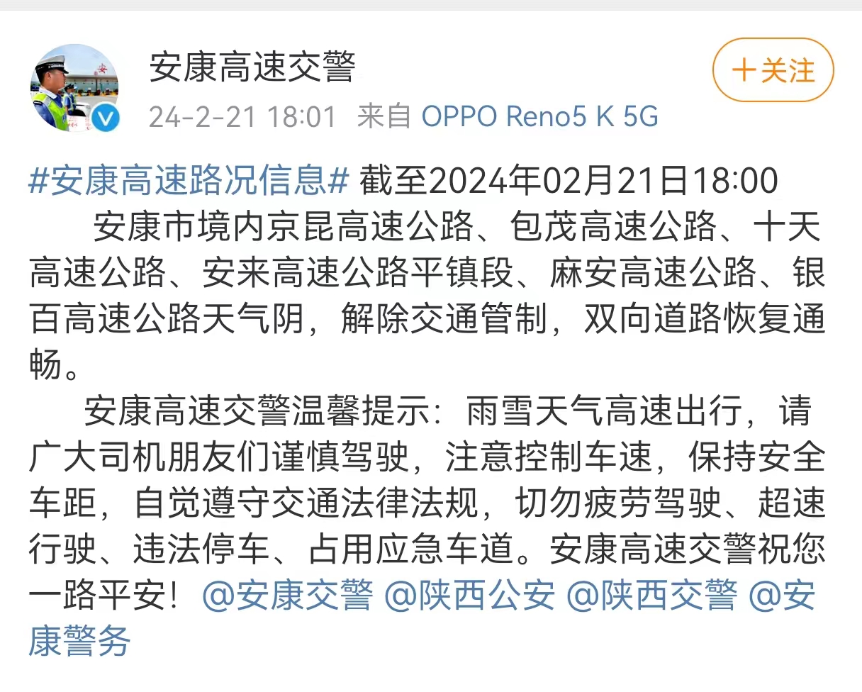 2月21日18時,安康高速交警發(fā)布消息:截至2024年02月21日18:40,安康市境內(nèi)京昆高速公路、包茂高速公路、十天高速公路、安來高速公路平鎮(zhèn)段、麻安高速公路、銀百高速公路天氣陰,解除交通管制,雙向道路恢復通暢。 禁止;愤\輸車輛和七座以上客車駛?cè)敫咚佟?span style="display:none">ric安康新聞網(wǎng)